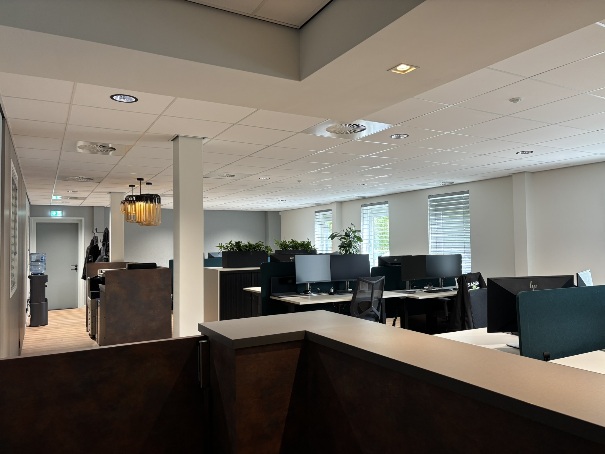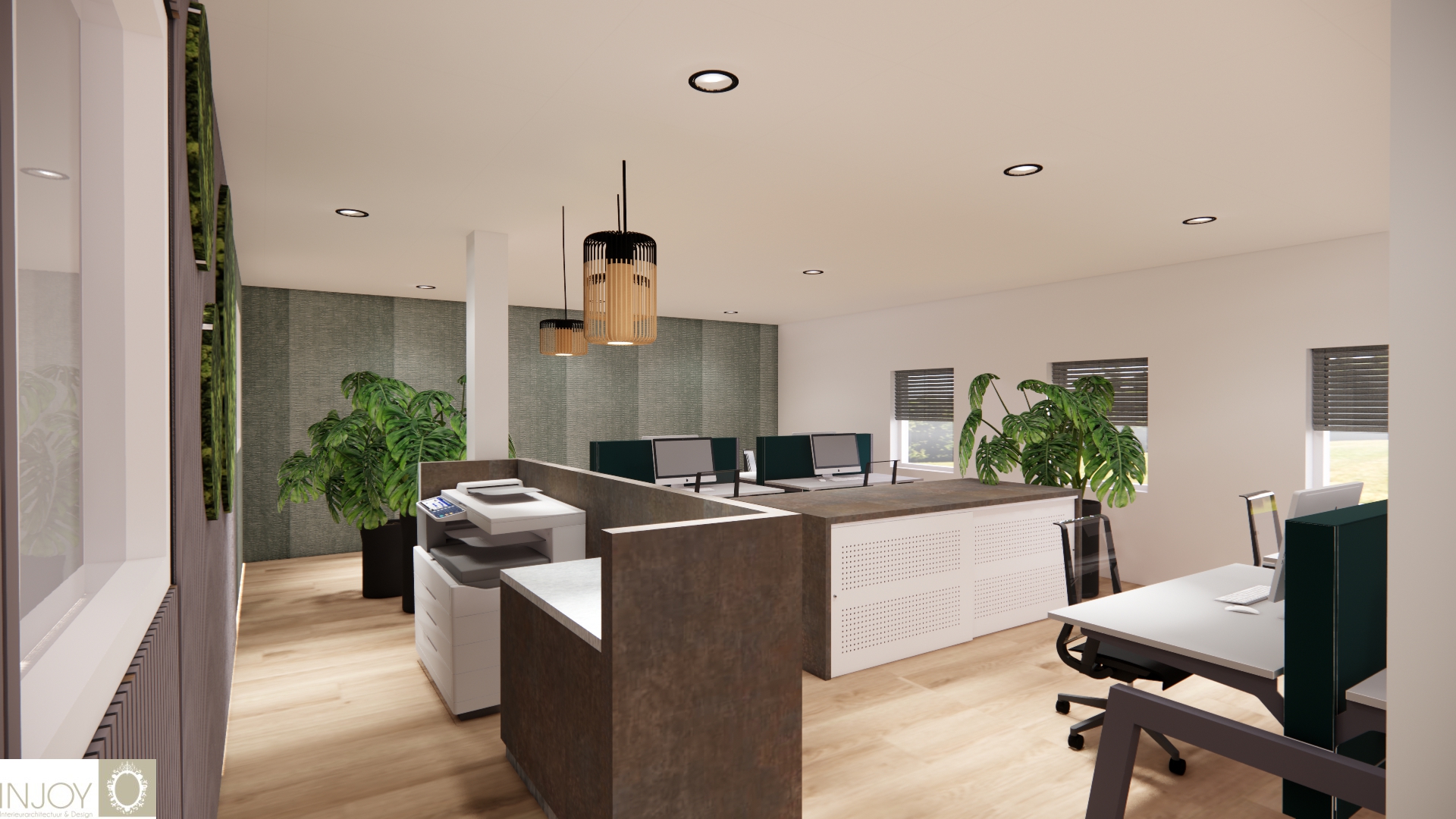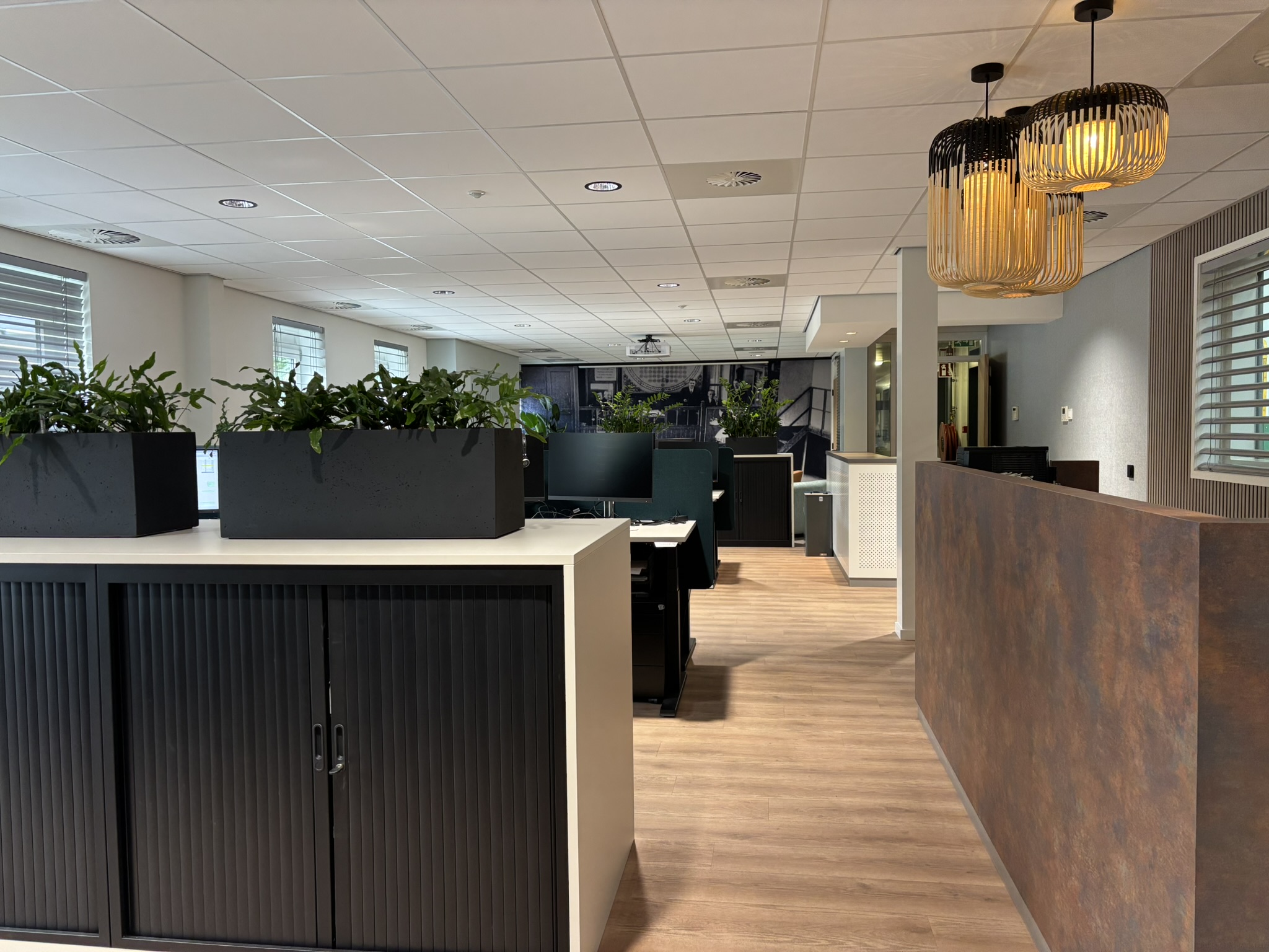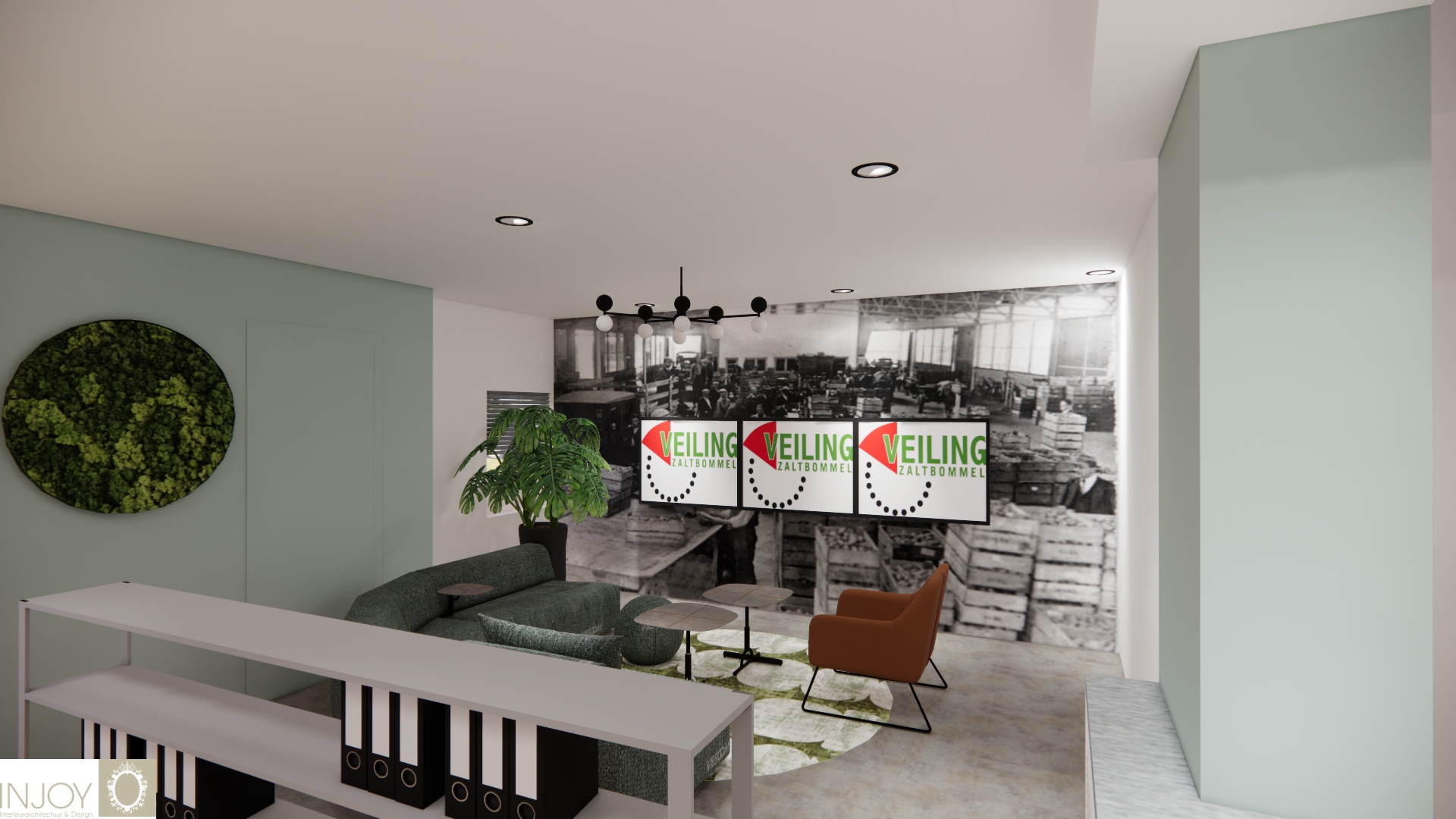Door de actieve werkwijze op deze afdeling alle werkplekken symmetrisch ingedeeld en apart een print met pantry meubel gemaakt. De groene kleuren en houtlook materialen passen binnen de huisstijl van de Veiling met een knipoog naar een historisch beeld van fruitveiling lang geleden..
