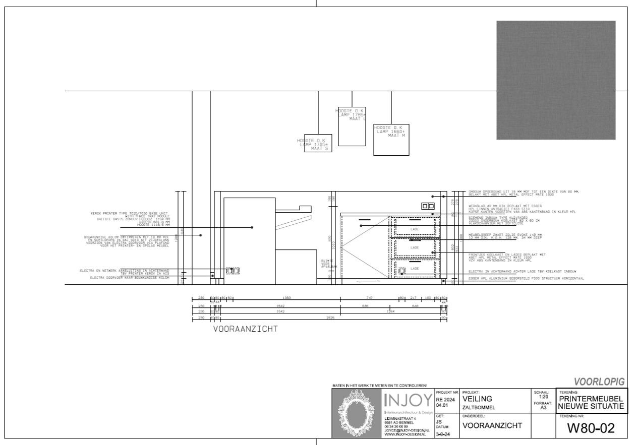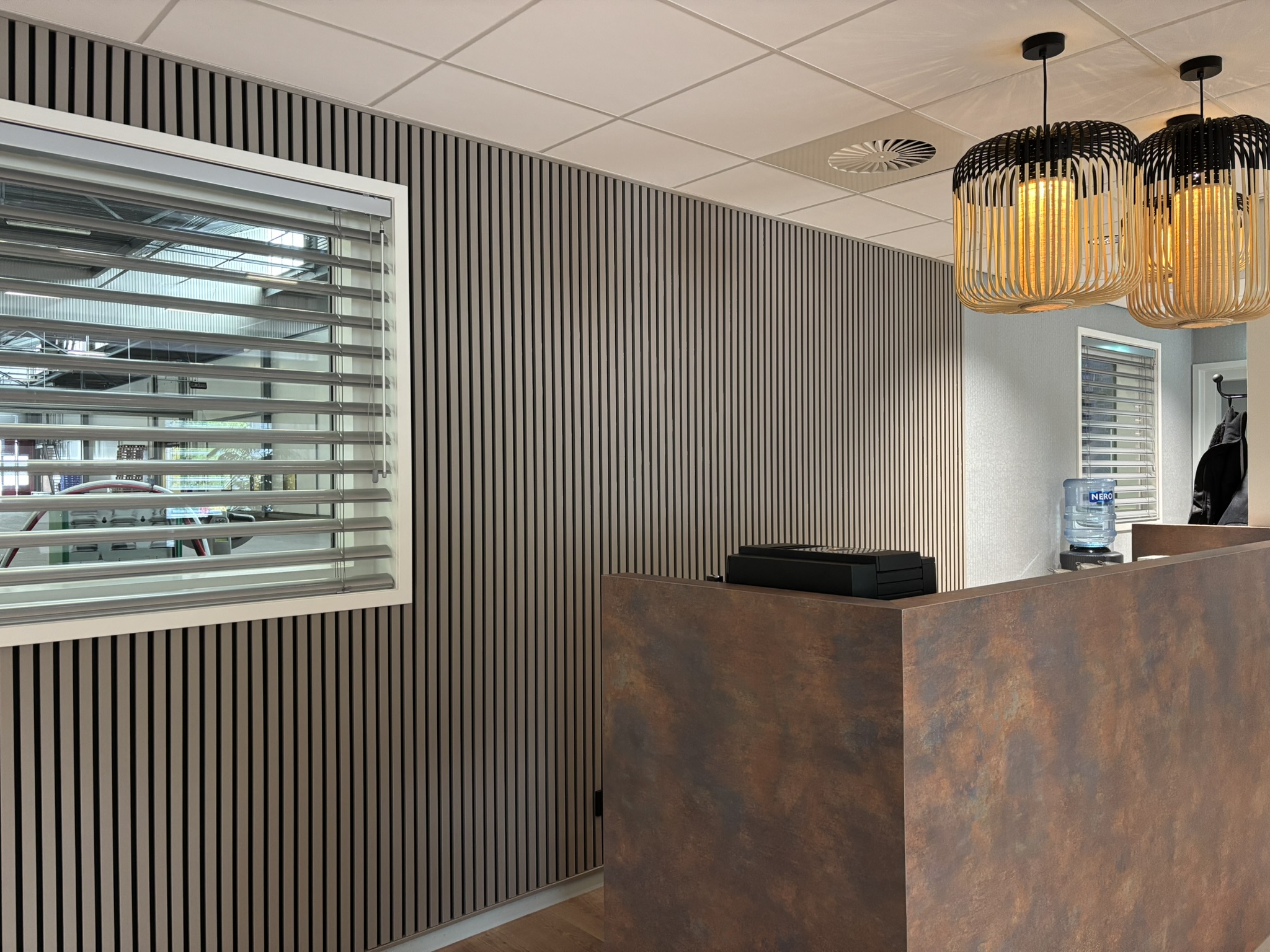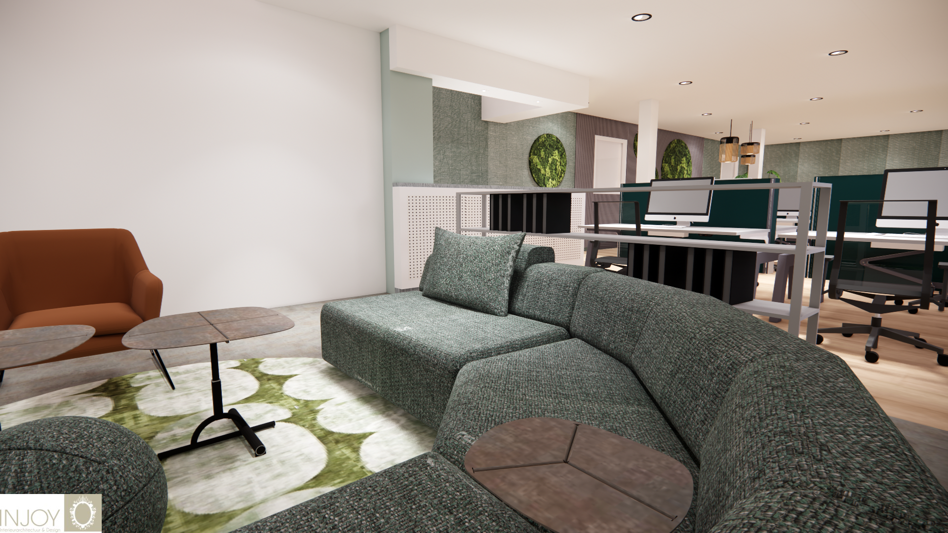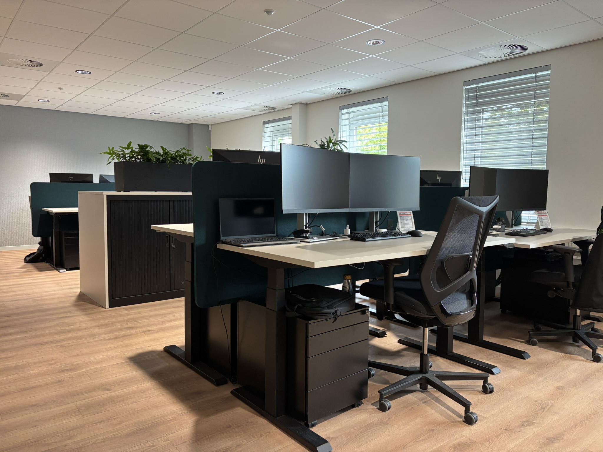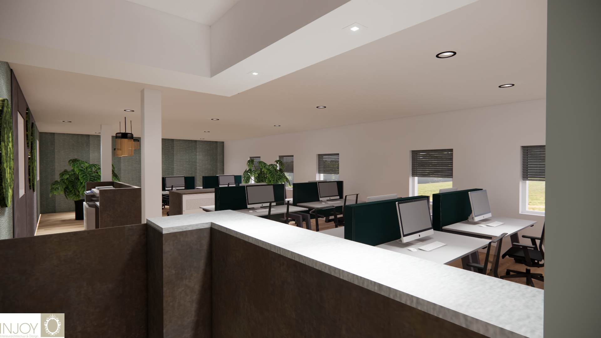 Door de actieve werkwijze op deze afdeling alle werkplekken symmetrisch ingedeeld en apart een print met pantry meubel gemaakt. De groene kleuren en houtlook materialen passen binnen de huisstijl van de Veiling met een knipoog naar een historisch beeld van fruitveiling lang geleden..